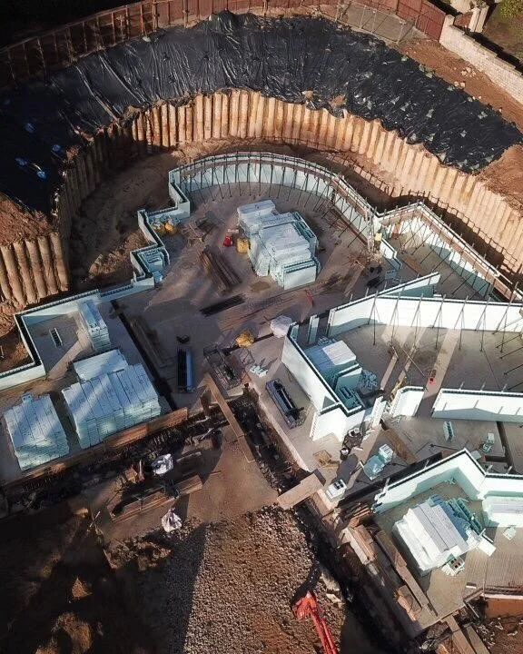 ICF - insulated concrete formwork. Building blocks that create reinforced framework for walls and floors with integral insulation.